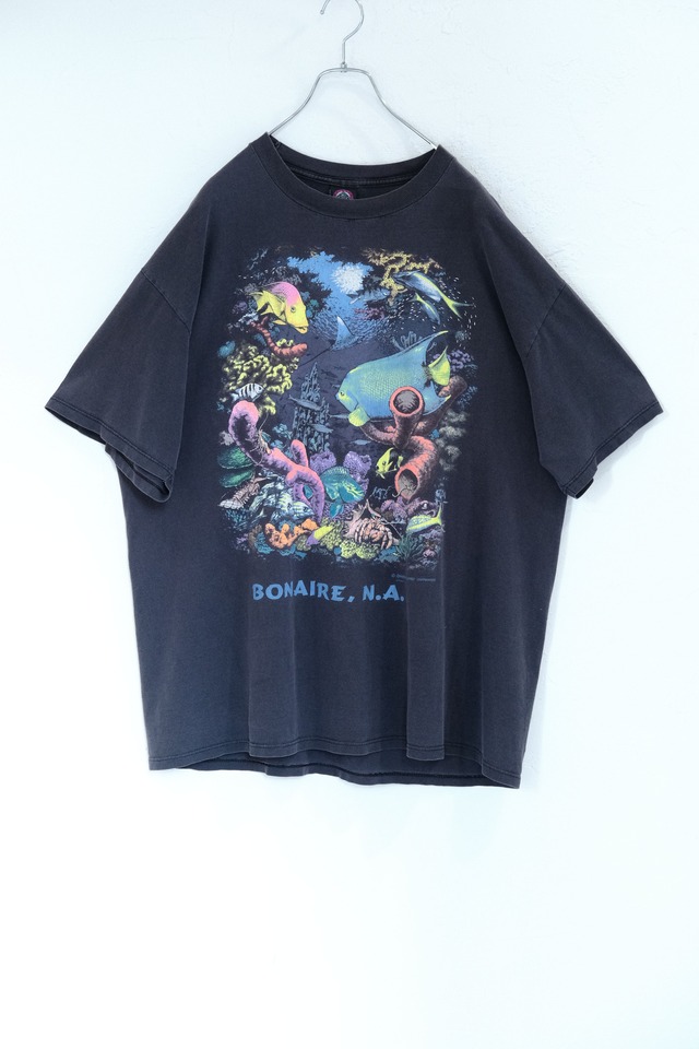 brand / RAINBOW GRAPHICS date / 不明 model / カリブ海に位置するオランダ領の特別自治体である「ボネール島」のTシャツになります。 暖かい海に生息している魚介類のかわいいプリントがデザインされております。 made / 不明 features / クルーネック(丸首)、半袖 color / ブラック pattern / プリント material /コットン100% size / XL 着丈:79cm 身幅:64cm 肩幅:56.5cm 袖丈:21cm