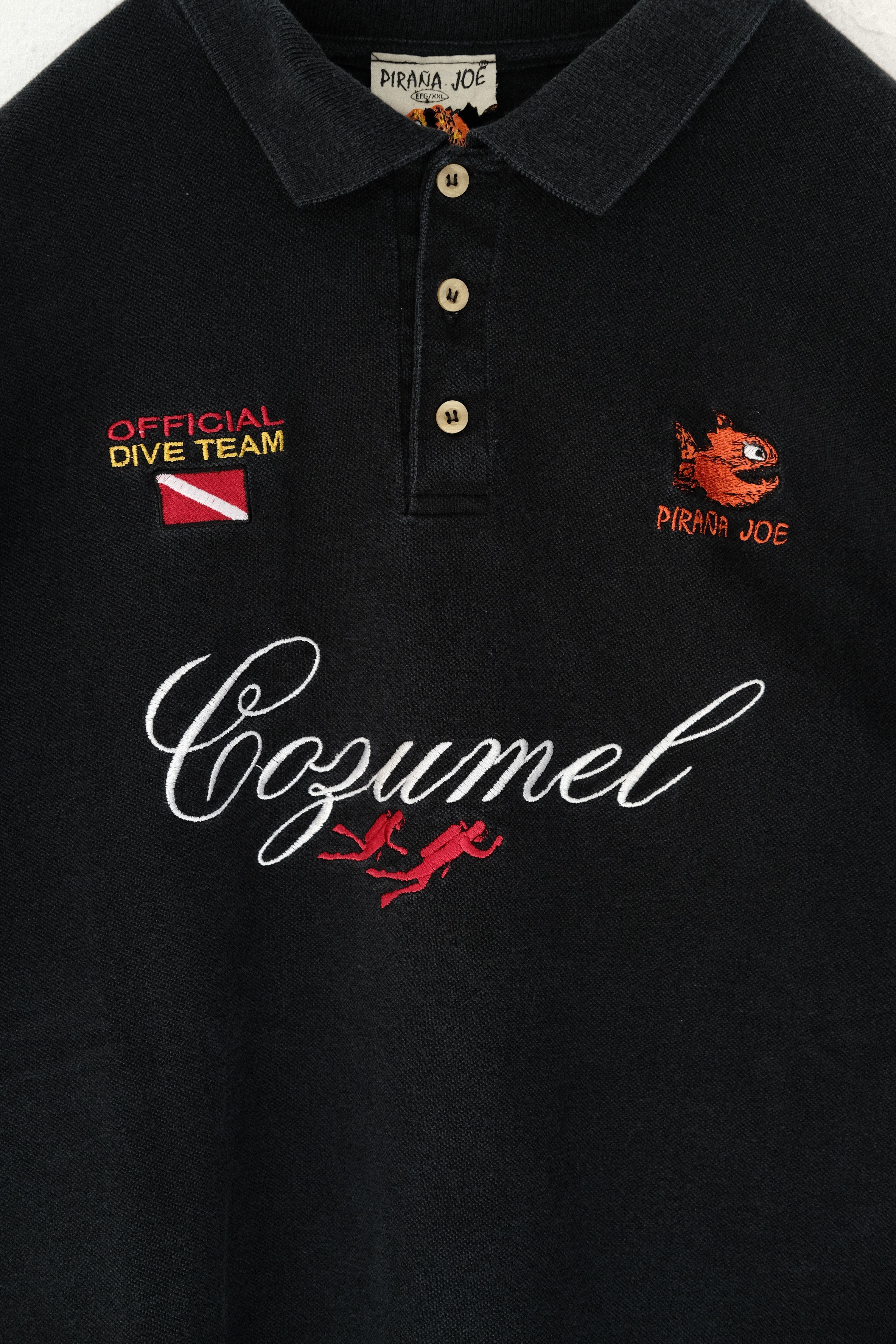 真ん中には、コスメル島の刺繍、ダイバーの刺繍等の海に関するデザインで、全体的に統一感があるポロシャツになります。