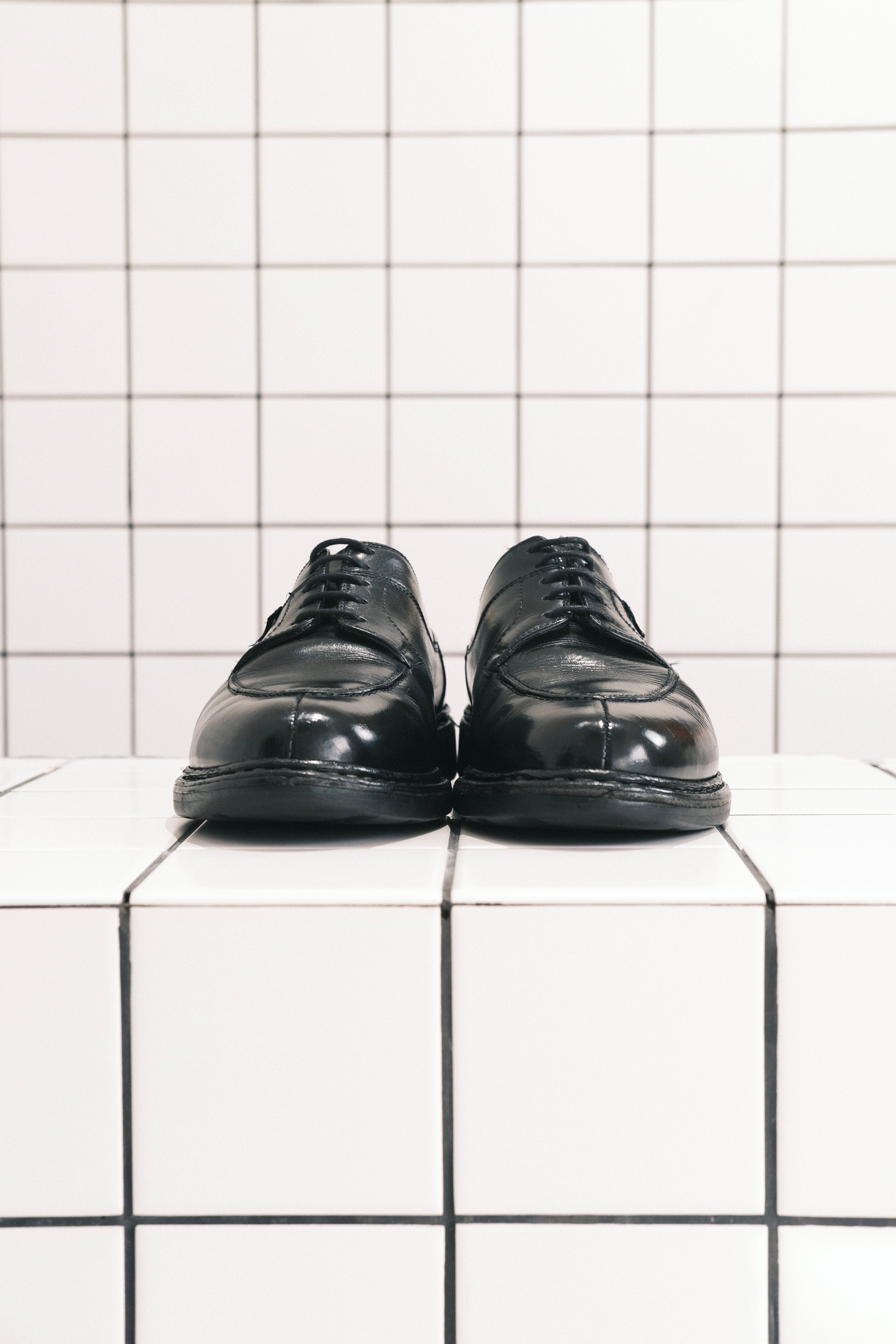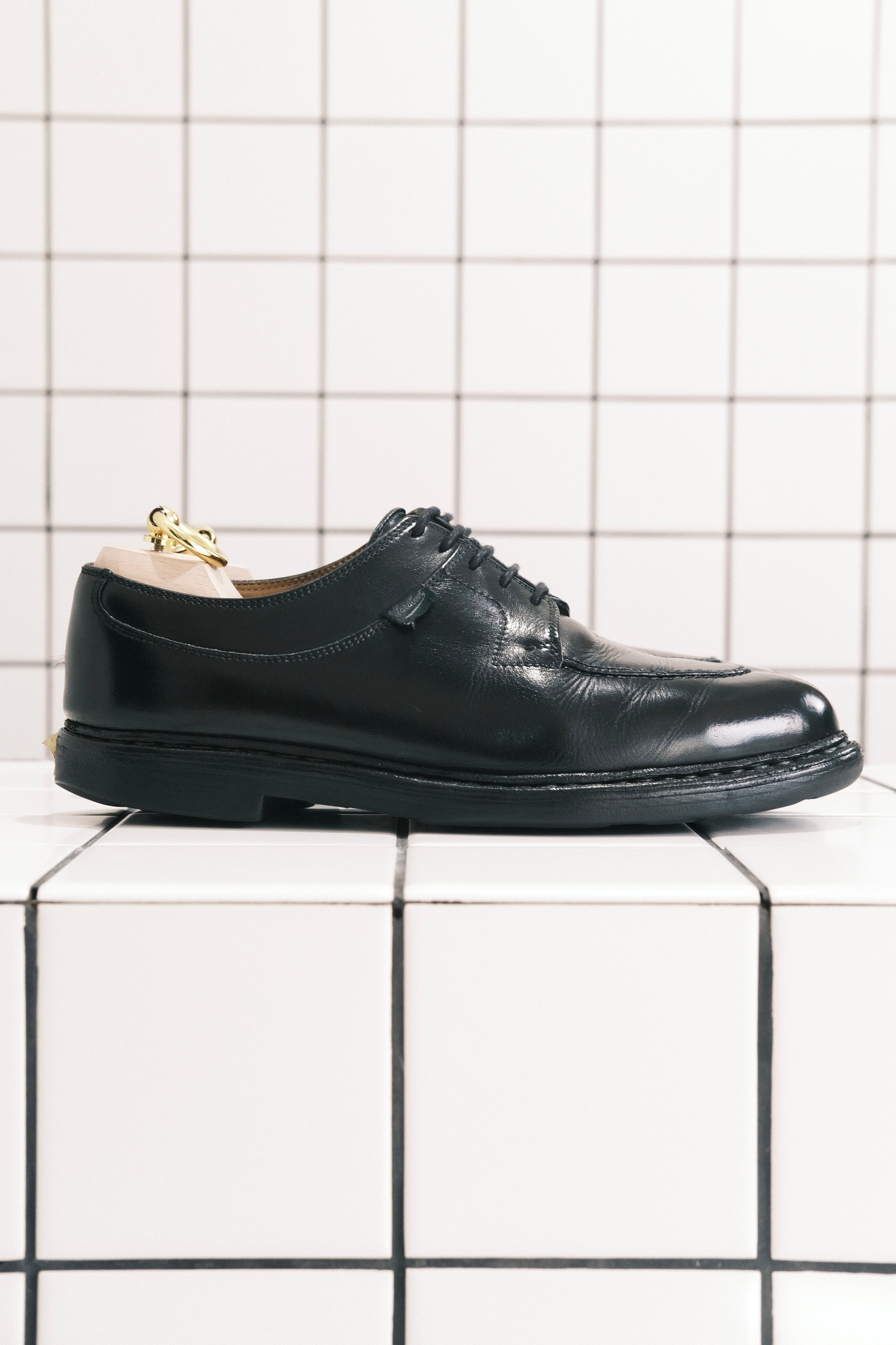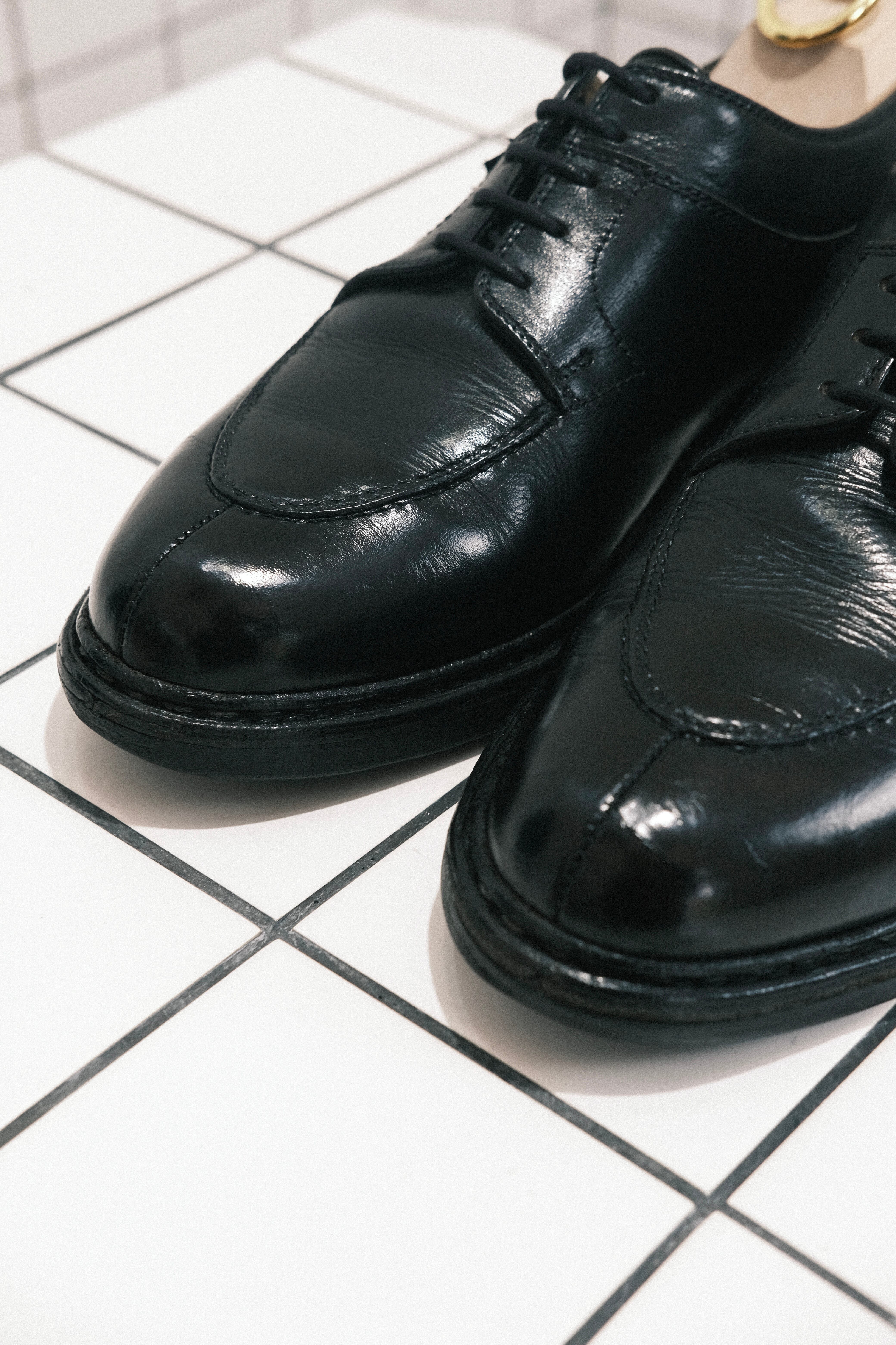 ヴァンプの革をアッパー側面に乗せて縫う、いわゆる乗せモカで作られるベーシックなUチップシューズです。履き口の切返しのデザインは、パラシュートブーツを原型としています。