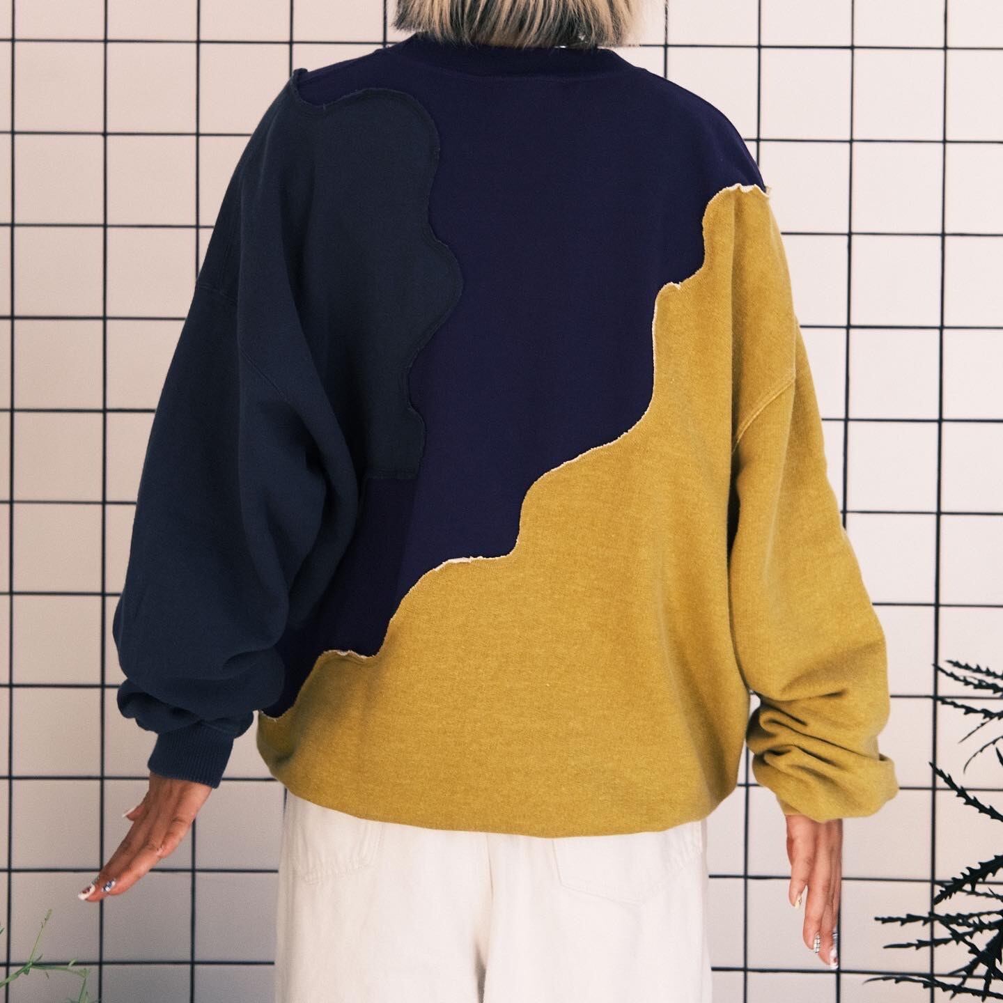 スウェットを3枚使ってリメイクしており、波打ったデザインにしています。