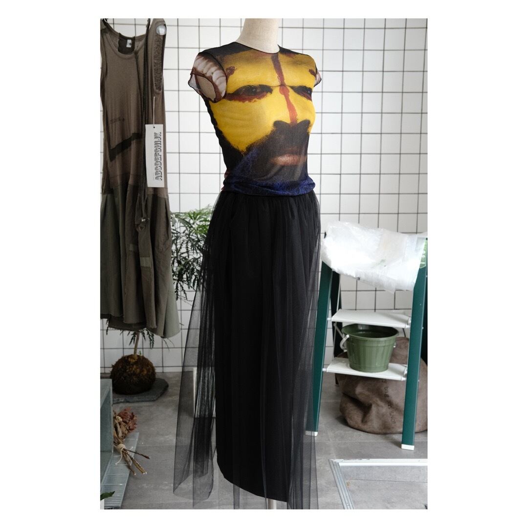 種類で言うとTシャツになるかと思いますが、透け感、伸縮性のある生地を使用しており、インパクトのあるデザインの少し変わった1着です◎